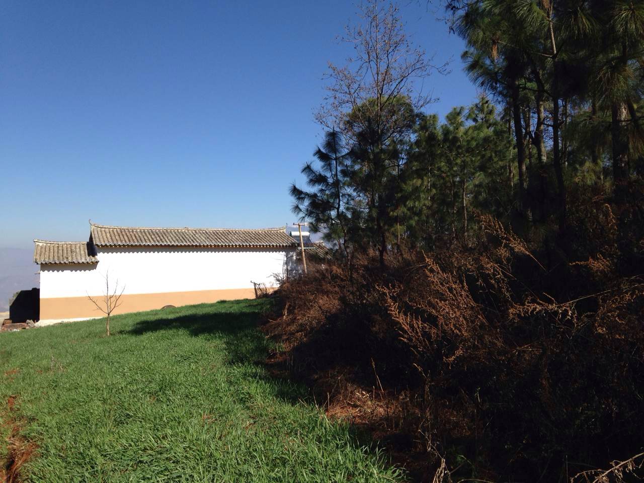 Many things have been achieved.  Water is there as well as electrity.  The main living quarter has got a new  traditional Chinese roof. All the partitions inside have been demolished and the ceiling of the ground floor has been elevated and reinforced in a way that it can support a full first floor that covers all the surface : a nice provisional living quarter.  The space to the right of the living quarter has been converted into a fully equiped bathroom.  The space to the left which used to be  a stinking old brewing place has been converted into a pretty, cosy bedroom.  The iron door and windows frames have been changed for wooden ones.  The first floor is henceforth connected with a viewing platform that has been masterminded by Minyan.  We will be able from now on to move in and live there in acceptable conditions.