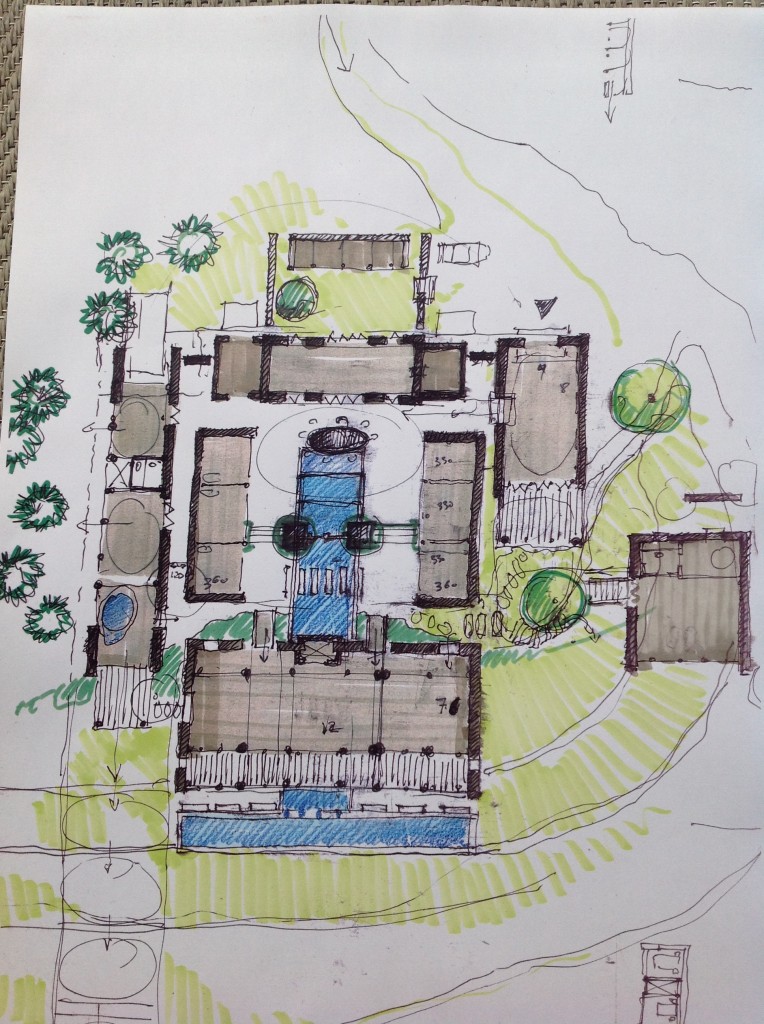 This comes out as a farm with eight bedrooms and a large meeting room that is melted down in nature. The sketch is here : The building material will be earth brought to the finest possible technological edge.